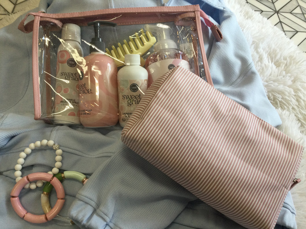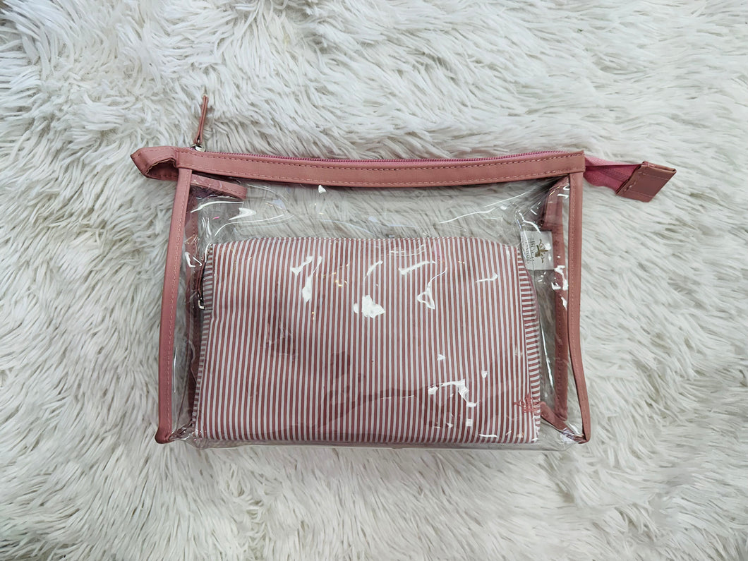 "Get ready to slay with the Mia Cosmetic Set! This set includes a trendy pink striped bag inside a bigger, see-through bag for all your makeup storage needs. Perfect for on-the-go touch ups (or impressing your vanity-loving friends)."