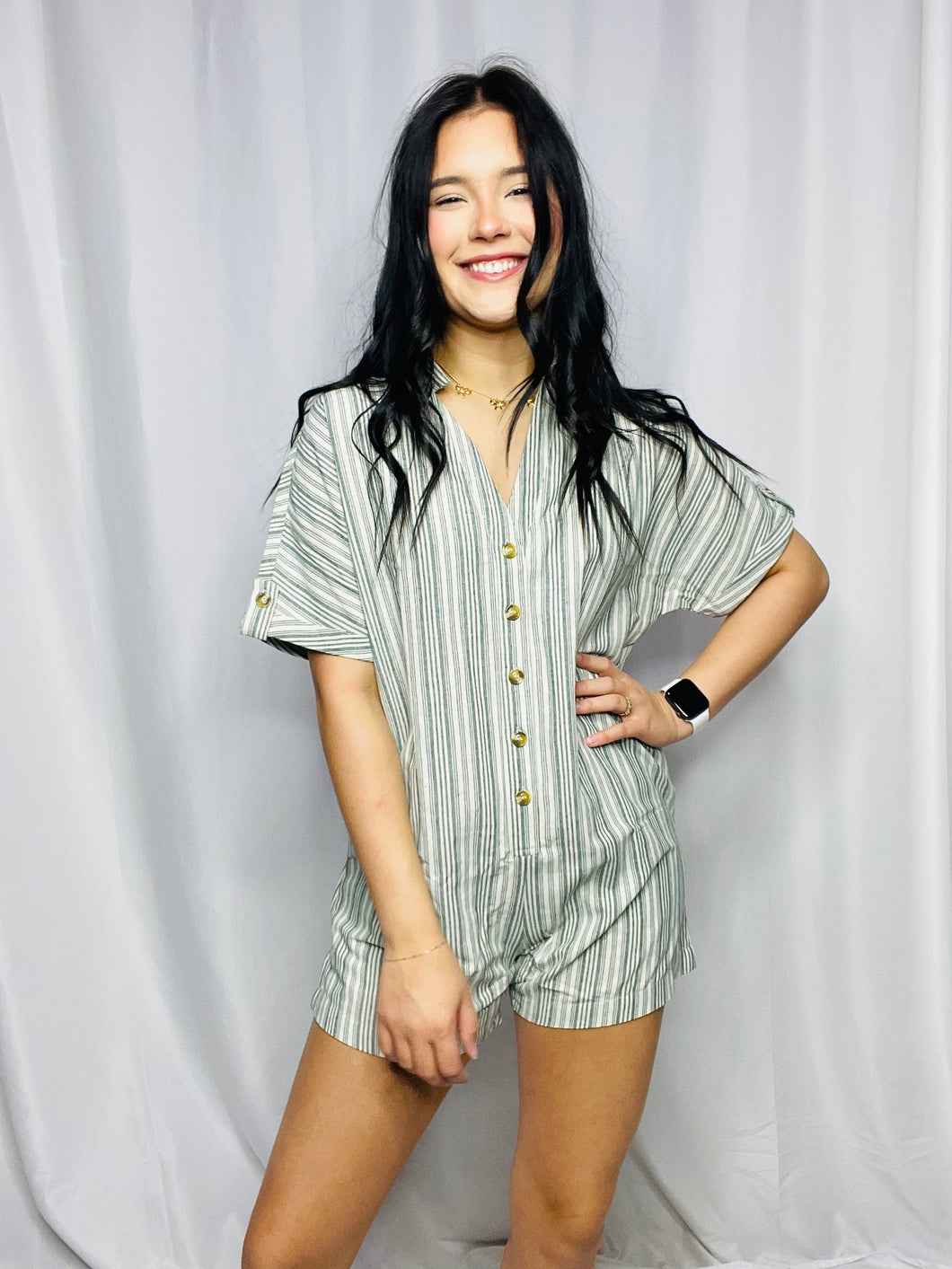 Get ready to strut your stuff in our Strips and Green Romper! This collared romper not only gives you a chic look, but it also has pockets for added convenience. A perfect choice for a playful and stylish outfit. (P.S. You'll never want to take it off!)