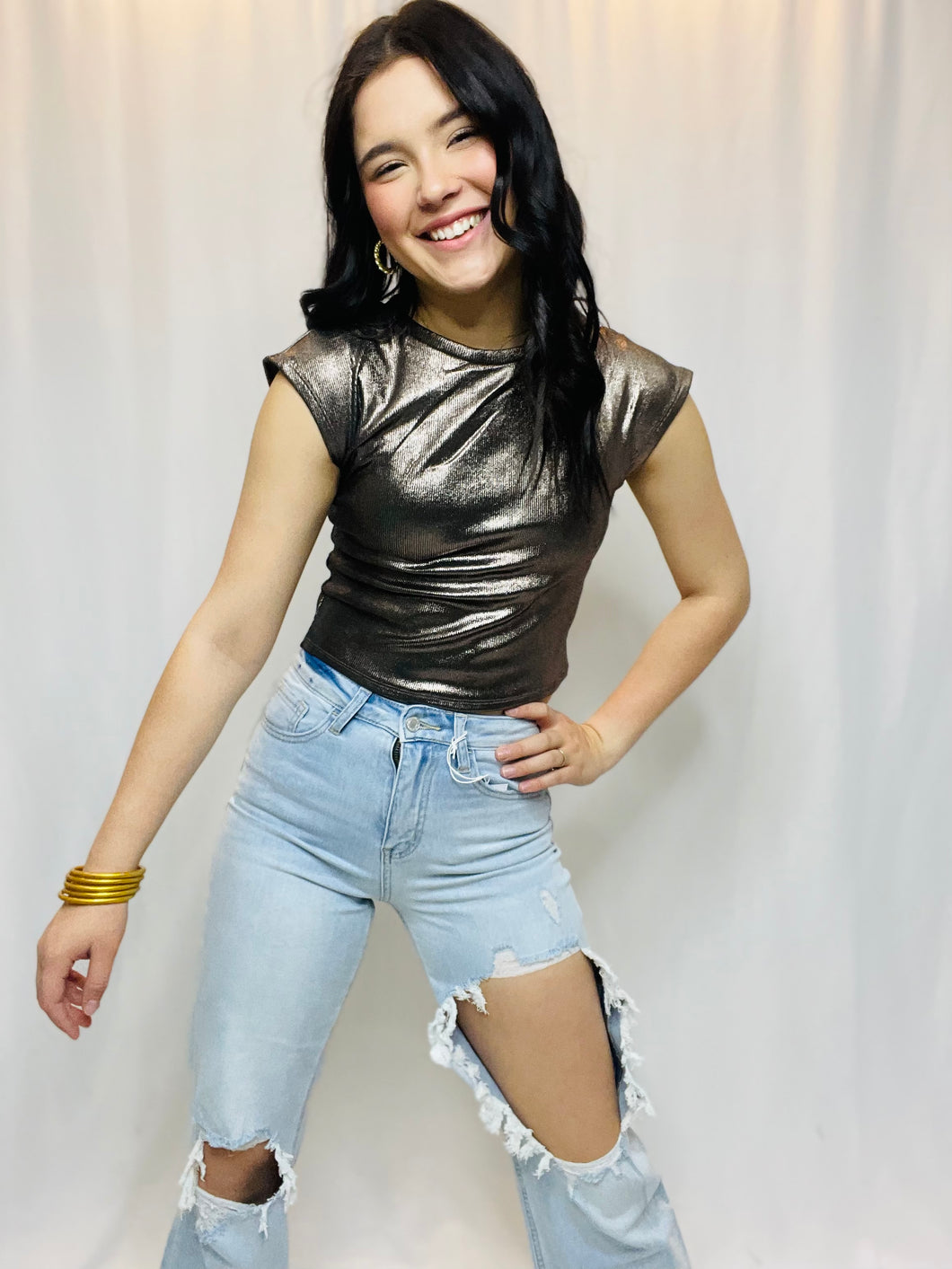 Upgrade your wardrobe with this eye-catching Beautiful in Bronze Crop Top! Its shimmery bronze fabric and back cut-out detail will turn heads and have you shining from day to night. Snag your size and sparkle away!