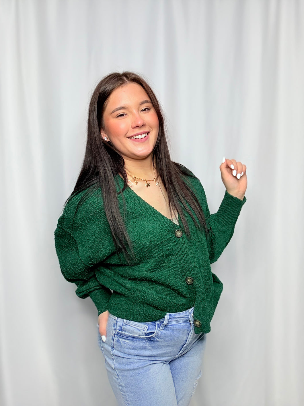 Get ready for the holidays with our Cozy Christmas Cardigan! This evergreen knit button-up will keep you warm while spreading festive cheer. Perfect for snuggling up by the fire or rocking at holiday parties. (Sleigh your winter wardrobe with this stylish cardigan.)