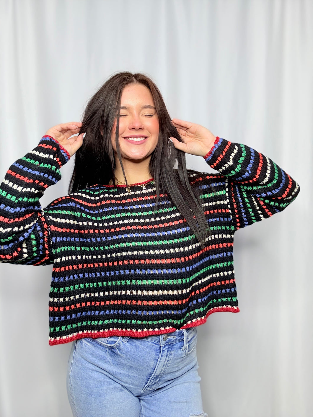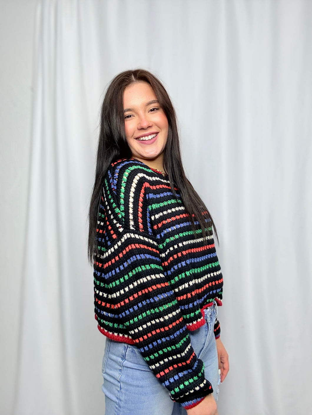 Get ready to brighten up your wardrobe with our Full of Color Sweater! This black sweater features playful stripes in a variety of vibrant hues, making it the perfect pop of color for any outfit. Crafted with a cozy crochet knit, this sweater is both stylish and comfortable. (Don't settle for boring sweaters - this one is truly full of color!)
