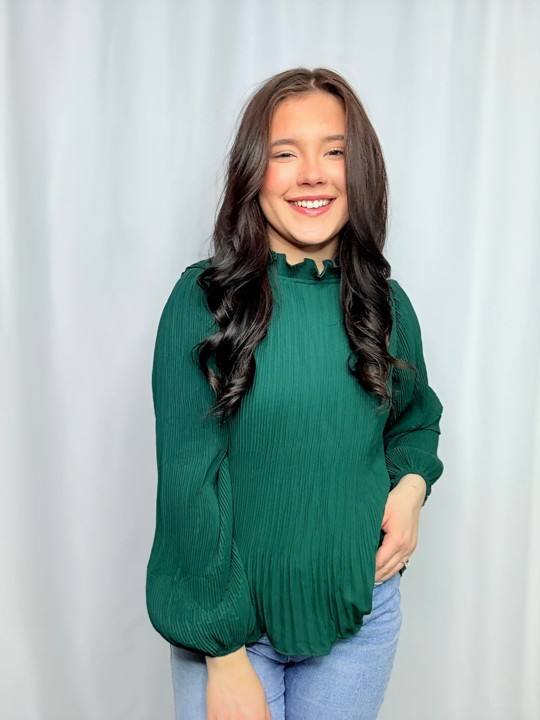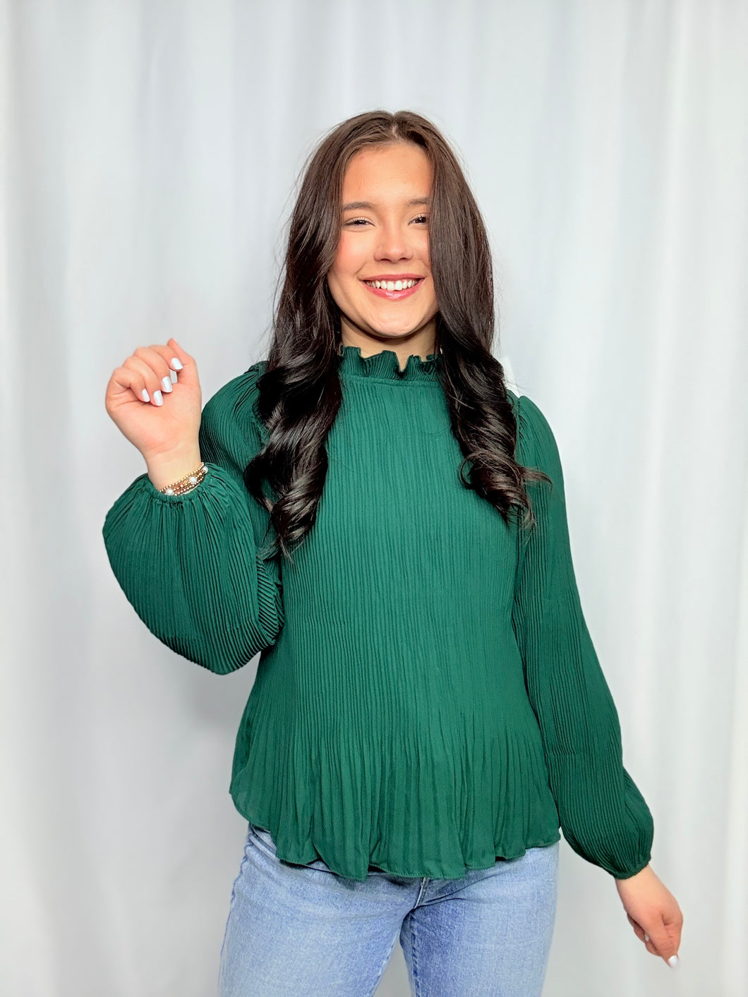 Get ready to be the center of attention with our bold Hunter Green Pleated Blouse! The rich green color and delicate pleats add an unexpected twist to this classic piece. Perfect for any occasion, this blouse will make you stand out in style (without trying too hard).