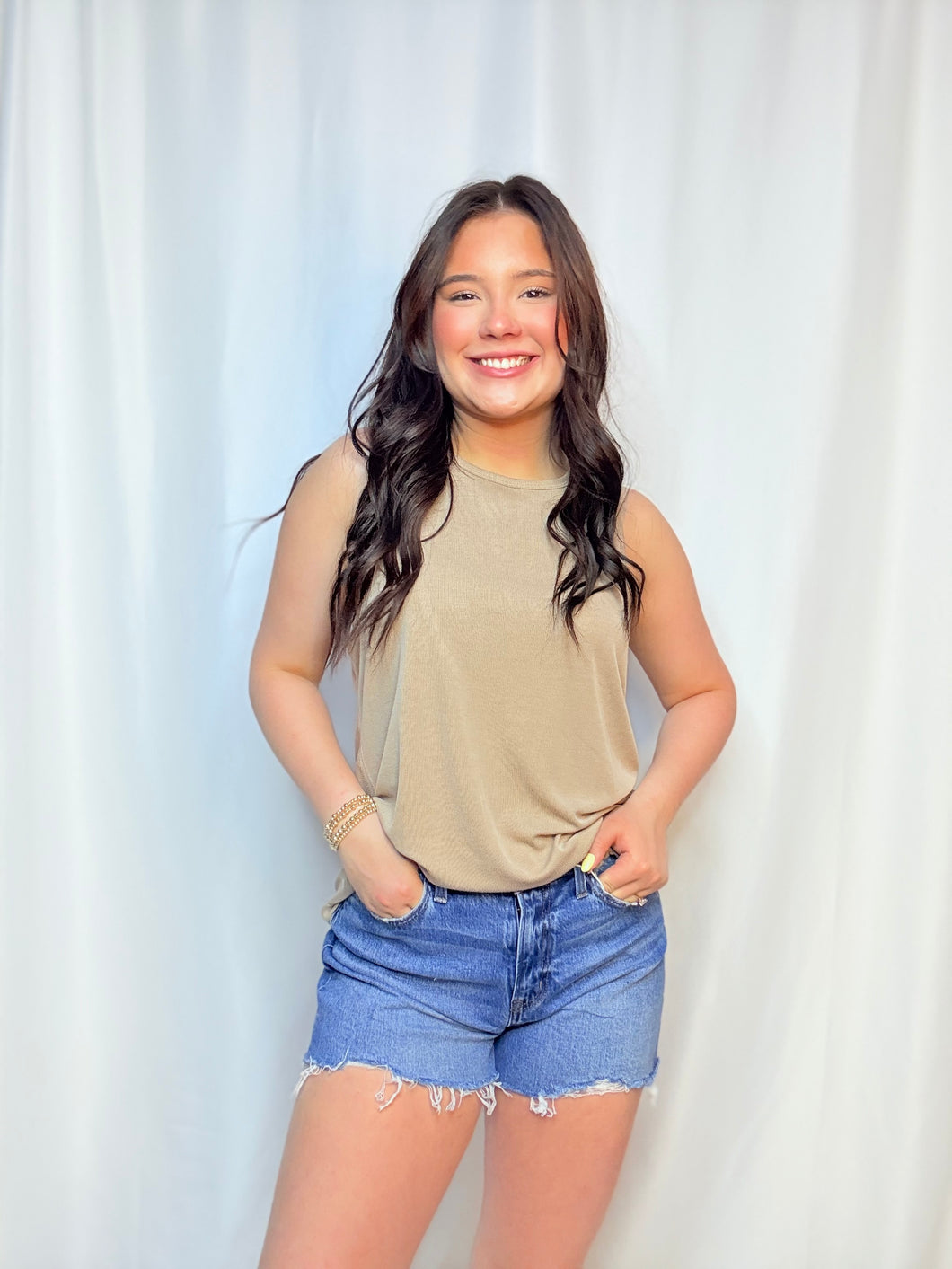 "Unleash your playful side in this Open Back Tan Tank. Leave your back open to the breeze (and admiring looks) while you stay cool and stylish. This tank is perfect for a day out with friends or a casual date. Be carefree and confident in this quirky tank."