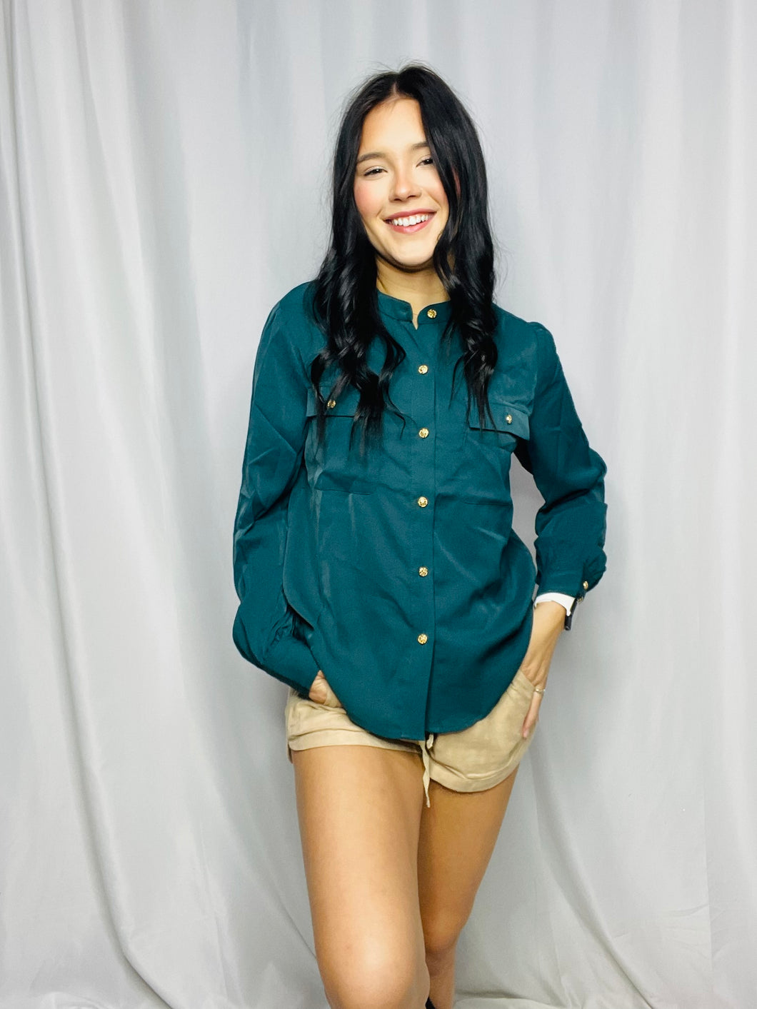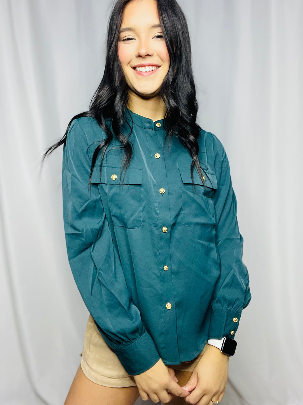 Unleash your inner fashionista with our Slick as Silk Button Up. This hunter green top features gold button accents, making it the perfect combination of class and sass. Get ready to turn heads and make a statement with this sleek and stylish piece.