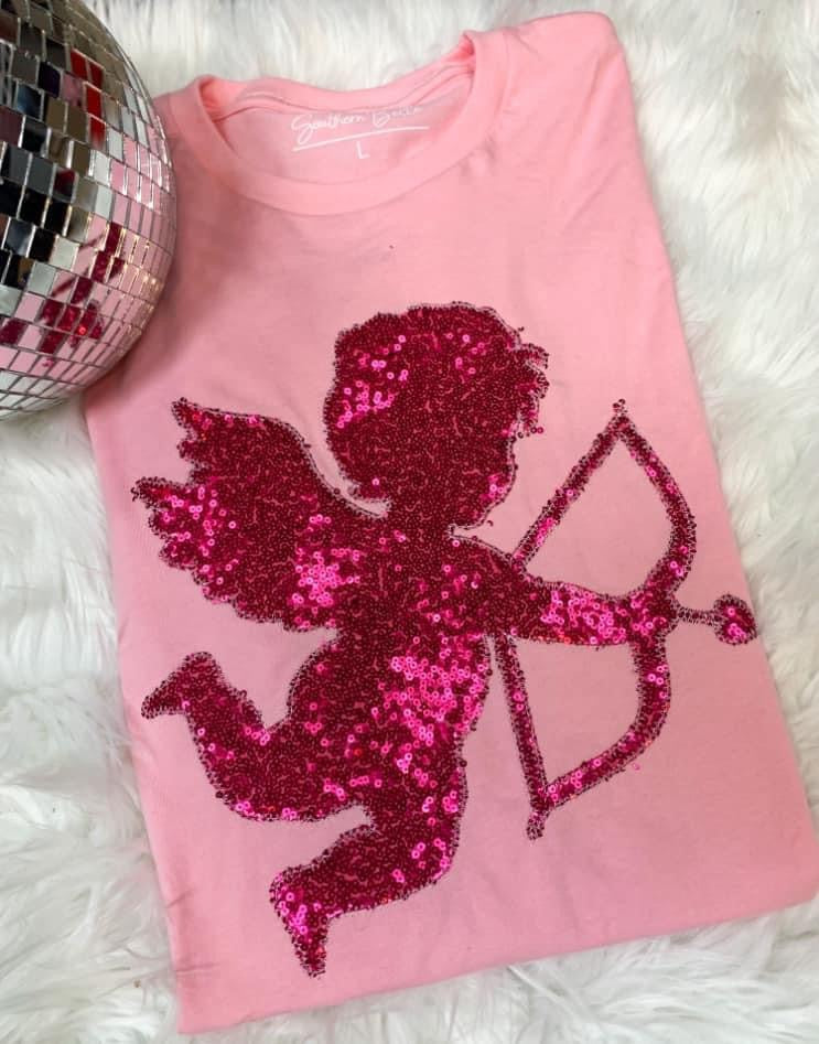 Spread love and sparkles with our Cupid's Kiss Tshirt! This playful pink tee features a sparkling sequin cupid, adding a touch of whimsy to your wardrobe. Perfect for adding some fun to your everyday look or for a Valentine's Day outfit. Love is in the air, and on your shirt!
