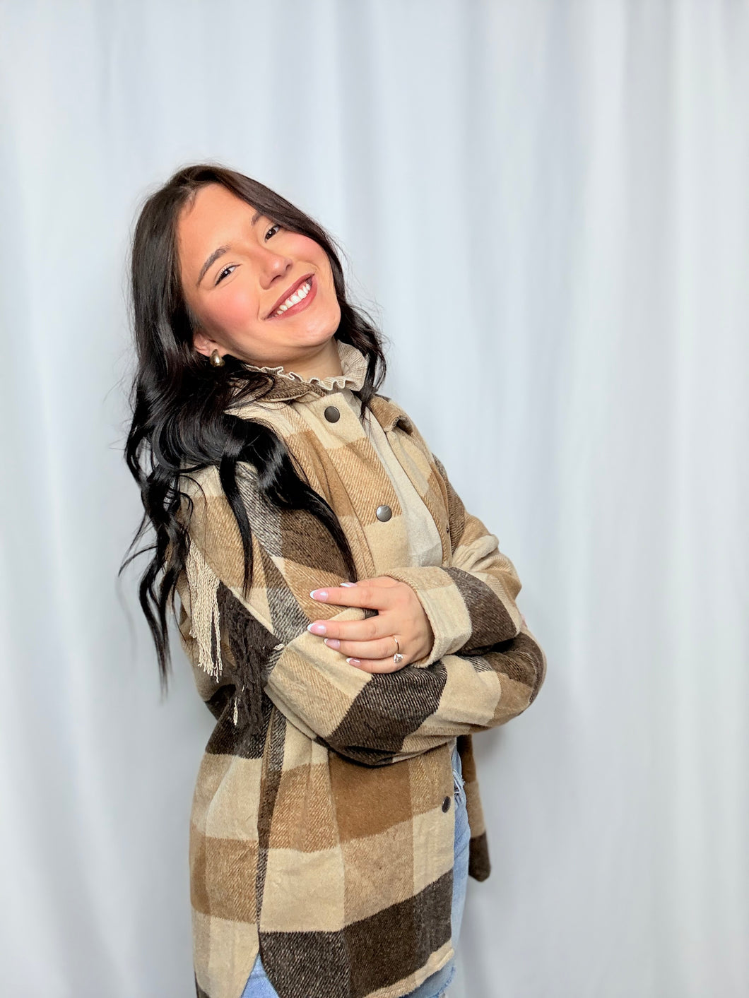 Fall for fall in this fringe flannel! Get cozy in this playful button up that adds a touch of comfort to your seasonal style. With its trendy fringe and classic plaid pattern, you'll be the talk of the town. Don't miss out on this unique and comfortable addition to your wardrobe!