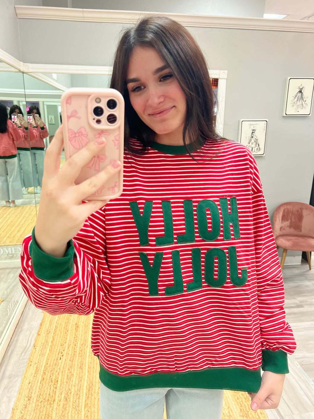Get into the festive spirit with this playful red and green striped sweater, featuring cheerful "Holly Jolly" embroidery. Its vibrant colors and fun design make it perfect for holiday gatherings, spreading joy wherever you go. Cozy and cute, it’s sure to brighten up your winter wardrobe.